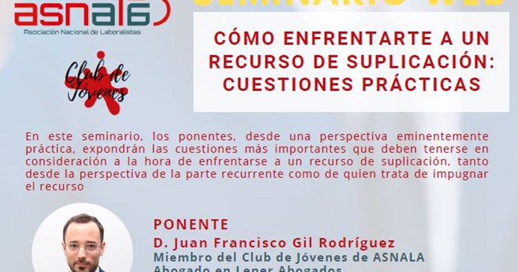 Nuestro compañero Juan Francisco Gil Rodríguez, abogado del Departamento de Derecho Laboral de Lener, participará el próximo jueves 19 de enero en el webinar “Cómo enfrentarte a un recurso de suplicación: cuestiones prácticas”, organizado por el Club de Jóvenes de ASNALA.